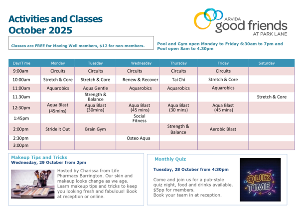 Book activity classes online via our website, in person at reception, or by calling 0800 20 4120